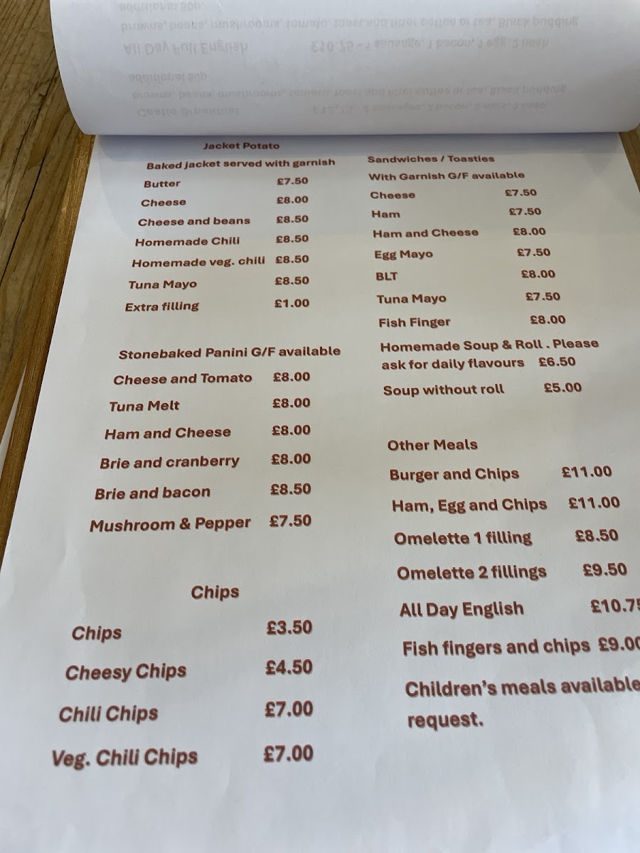 For lunch, the jacket potatoes steal the show with tempting toppings like homemade chili and classic cheese. Sandwich enthusiasts can indulge in various options, from BLTs to creamy tuna mayo, all crafted with fresh ingredients. Don't overlook their selection of comforting chips, including cheesy and chili variations.